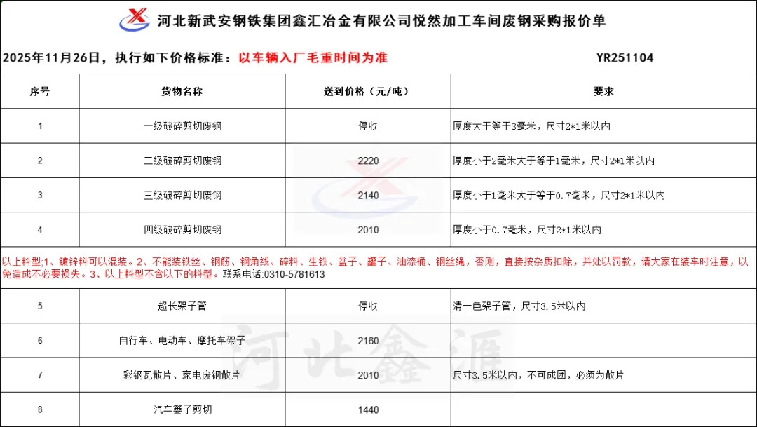 鑫匯公司悅?cè)患庸ぼ囬g廢鋼采購(gòu)報(bào)價(jià)